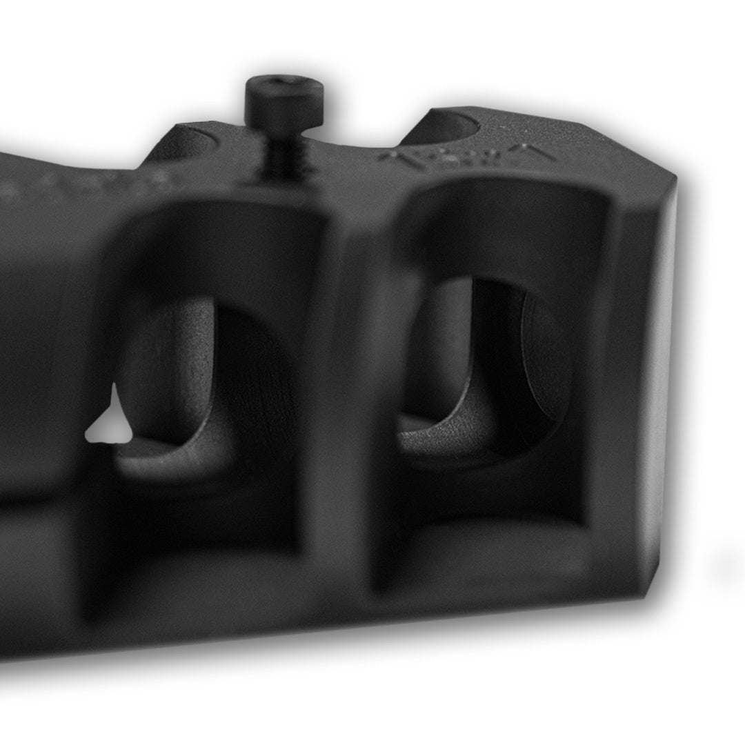 Myningsbromsen skruvas på pipan och sedan stabiliseras positionen ytterligare med hjälp av två medföljande skruvar. Högst upp på mynningsbromsen sitter även en liten skruv för att kunna fästa mirageskydd.